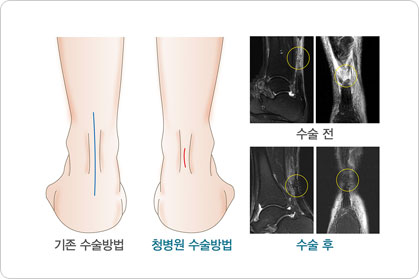 완전파열 또는 손상의 범위가 큰 부분파열의 경우에는 끊어진 아킬레스건을 다시 봉합하는 미세 절개 봉합술이 가장 효과적입니다. (과거에는 큰 절개창을 내어 봉합했지만 청병원은 최소침습적 기술을 이용한 다중봉합술을 시행하여 수술 후 통증과 합병증 발생을 현저히 낮추고 있습니다.)