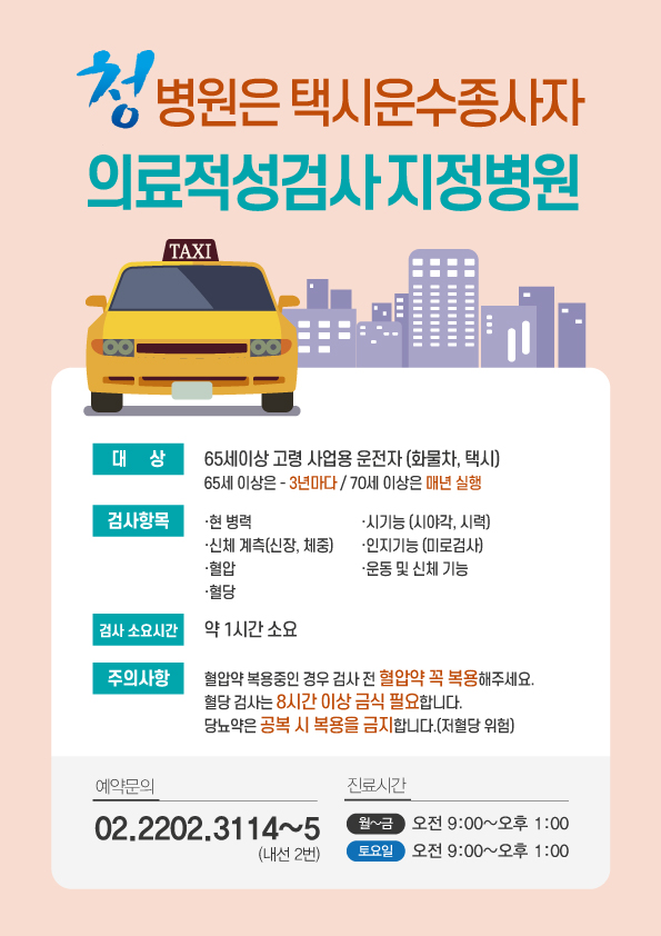 청병원은 택시 운수 종사자 의료 적성검사 지정병원입니다.